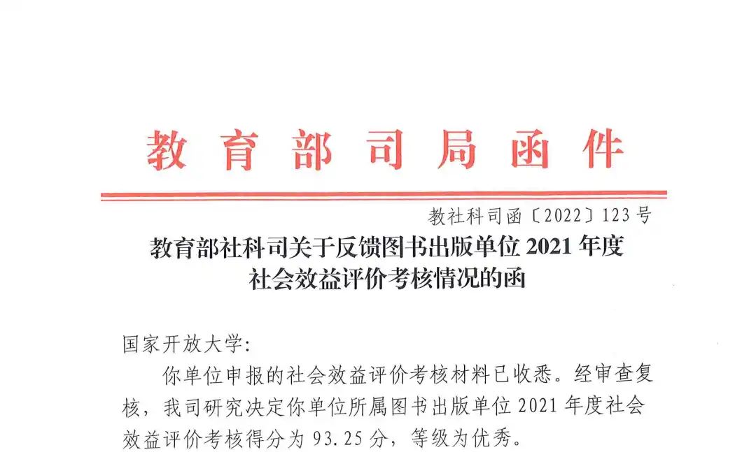 日前,教育部社科司下发关于反馈图书出版单位2021年度社会效益评价考核情况的函,球王会官网出版传媒集团下属出版社2021年度社会效益得分为93.25分,等级为优秀。这是出版社连续2年获得“优秀”评级,考核得分也再创新高。
