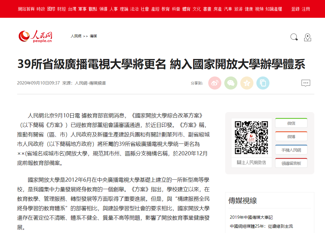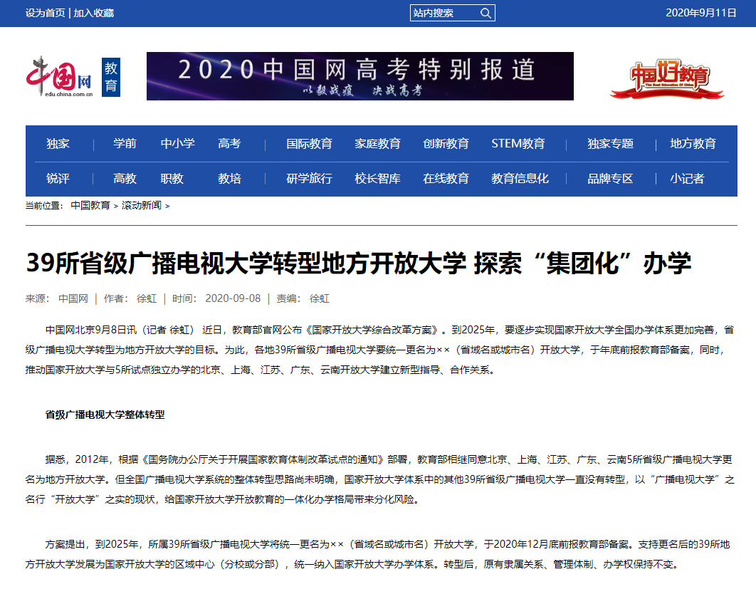 【中国网】39所省级广播电视大学转型地方开放大学 探索“集团化”办学