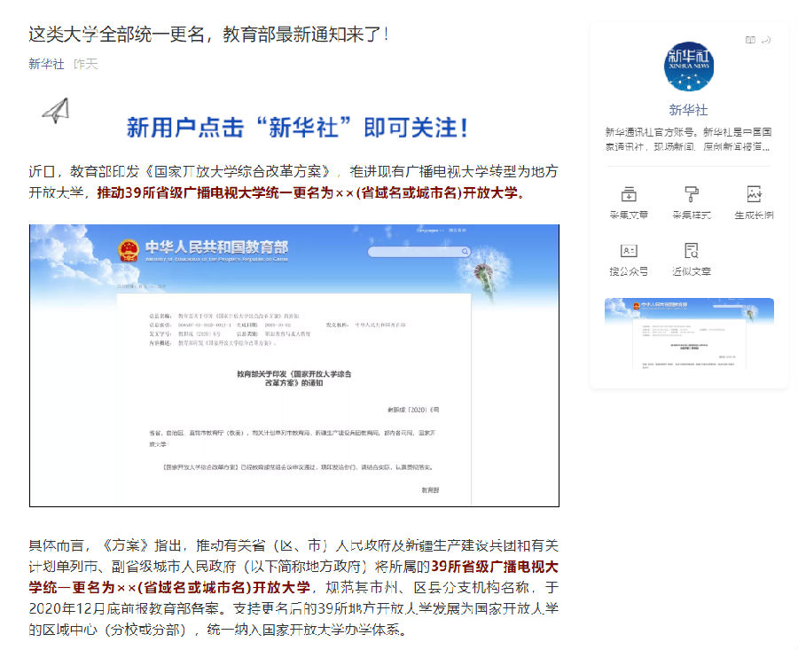 【CCTV新闻联播】国内联播快讯:全国39所省级广播电视大学统一更名