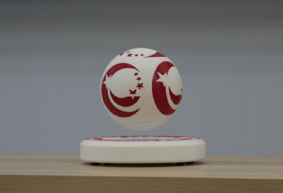 球王会官网磁悬浮LOGO,由印有红色球王会官网中英文名称字样的白色底座与印有球王会官网LOGO的白色悬浮球体两部分组成。该设计采用先进磁悬浮技术,选用新型的生物基及可再生生物降解材料——聚乳酸(PLA)为主体材料,利用3D打印技术制作主体造型,体现了技术与艺术的巧妙结合。