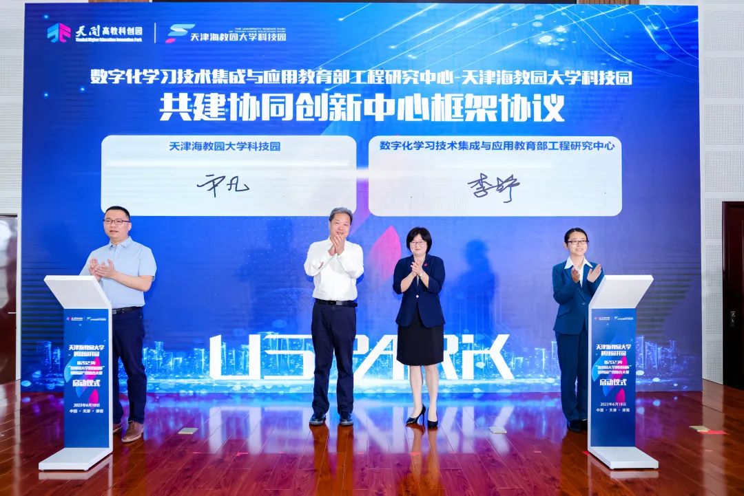 为深入实施科教兴国战略、人才强国战略、创新驱动发展战略,加快推进职普融通、产教融合、科教融汇,6月18日,球王会官网党委委员、副校长范贤睿率队参加天津海教园大学科技园开园仪式,并与天津开放大学党委副书记、校长张宗旺共同见证数字化学习技术集成与应用教育部工程研究中心(以下简称“工程中心”)与天津海教园大学科技园共建“数字化学习技术集成与应用协同创新中心”框架协议签署仪式。学校改革发展部、工程中心相关负责人及研究人员代表参加此次活动。