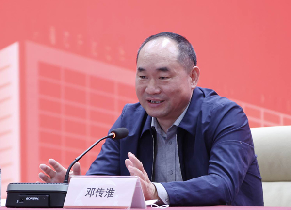 邓传淮指出,习近平总书记在庆祝中国共产党成立100周年大会上的讲话,大气磅礴、思想深邃、情真意切、充满力量,向全世界宣告了中华民族伟大复兴的光明前景,为实现第二个百年奋斗目标指明了前进方向、提供了根本遵循。习近平总书记重要讲话精神可以从一个主题、一个精神、一个宣告、一个征程、一个号召、一个嘱托、一个信号、一个理念这“八个一”来学习领会。一个主题即实现中华民族伟大复兴;一个精神即伟大建党精神;一个宣告即实现第一个百年奋斗目标,向着第二个百年奋斗目标迈进;一个征程即全面建成社会主义现代化强国;一个号召即号召全体共产党员努力为党和人民争取更大光荣;一个嘱托即勉励新时代的中国青年不负时代,不负韶华,不负党和人民的殷切期望;一个信号即加快国防和军队现代化;一个理念即和平、发展、公平、正义、民主、自由的全人类共同价值。