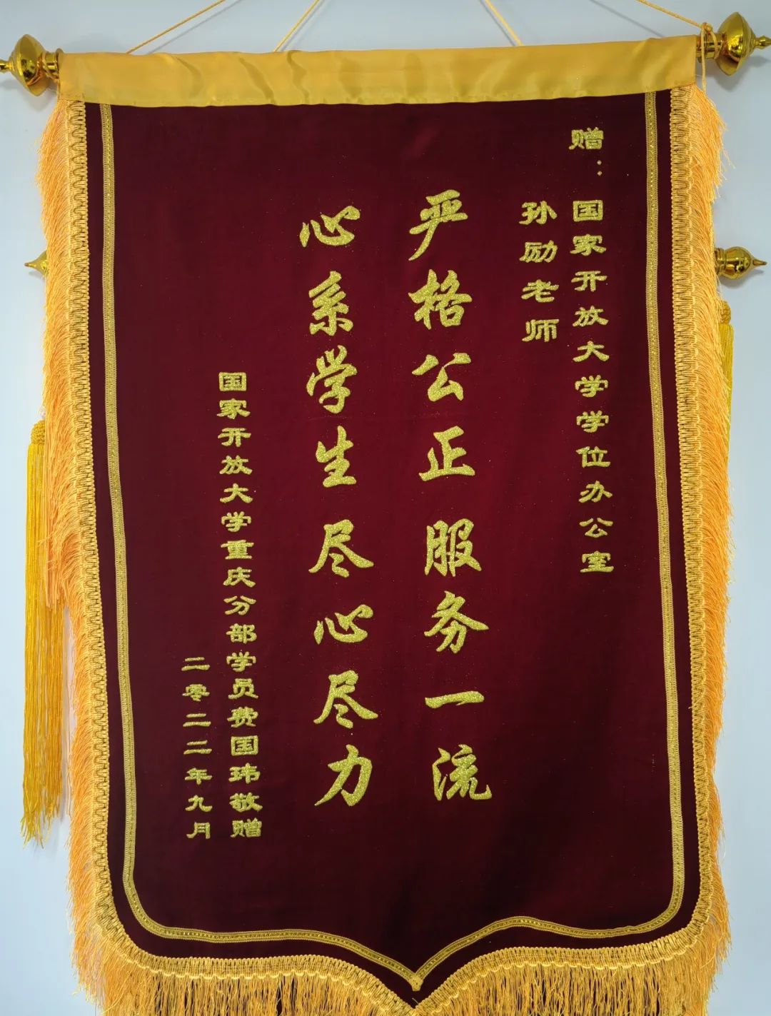 近日,一面写着“严格公正、服务一流、心系学生、尽心尽力”的锦旗,由重庆分部远程教育中心转送到了球王会官网教务部。锦旗由重庆分部的费国玮同学所送,她非常感谢母校能够及时处理她的学位证书问题,为表示感谢,特送上锦旗,以表心意。