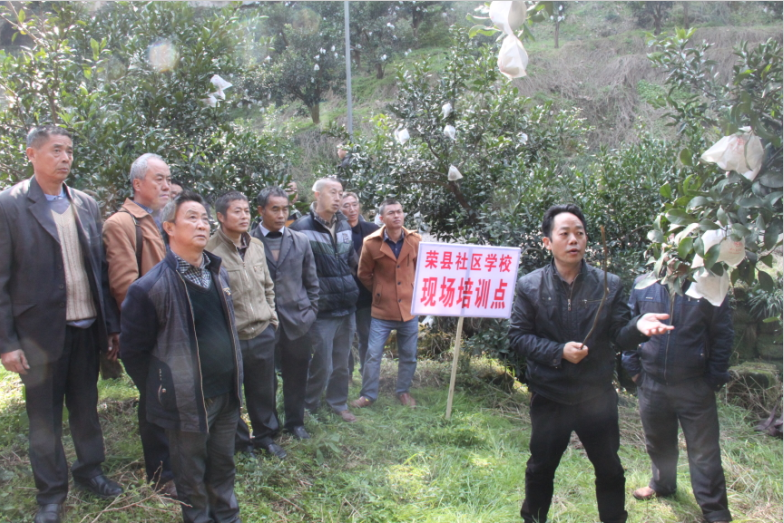 荣县社区学校是全省首批依托电大成立的县级社区学校。荣县社区学校根据本县特点,在培育新型农民、本土化特色课程建设等方面进行了探索,“果农大课堂”是其特色品牌,实施对象为种植大户、专业大户、养殖大户、农民经纪人及返乡农民工。在荣县社区学院新农民培训现场,记者与前来学技术的农民一起,实地感受了当地的柑橘管理技术。在留佳镇天邦水果合作社水果仓库,销售经理余中骄傲地介绍,通过社区教育学到的“气调”保鲜技术,既能保鲜,又环保健康,比以前的技术多卖出了几倍的价钱。据了解,近年来,荣县依托县社区学院(电大)资源,在乡镇设立社区教育指导中心,在村里设立培训站,面向村民举办各种种植养殖和营销技能等培训。几年来,荣县社区教育已经培养出了一大批生产经营型、专业技能型新型农民,不仅真正实现了促进当地经济发展,增加农民收入,而且也真正发挥了电大“把大学办在社会中”的作用。