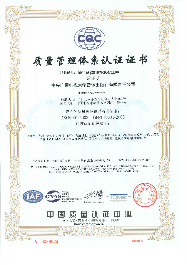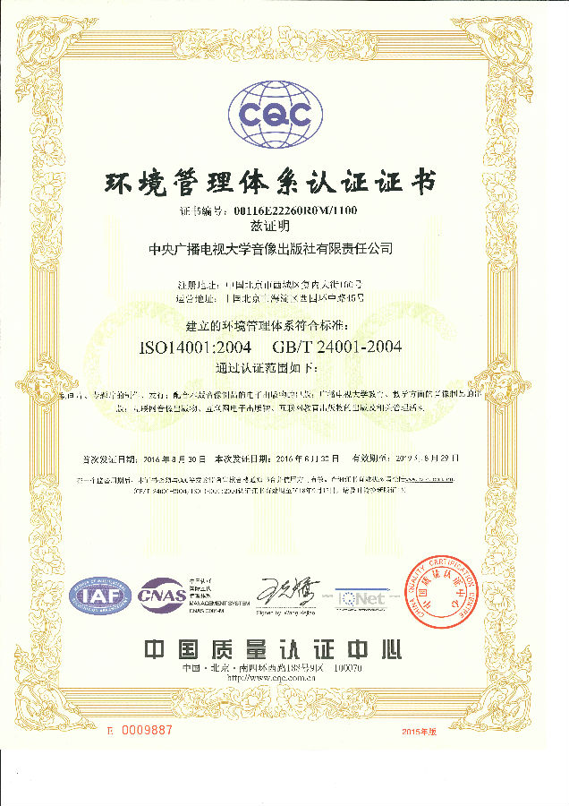 为进一步规范管理模式,有效控制经营风险,音像出版社从2016年初开始严格按照ISO质量管理体系的运行要求开展日常业务,认真梳理各项管理制度,规范工作流程,使节目质量、服务质量和管理质量得到较大提升。日前经过中国质量认证中心(CQC)专家全面、细致的指导和审核,确认音像出版社符合质量体系标准要求,并向音像出版社正式颁发ISO9001:2008质量管理体系和ISO14001:2004环境管理体系认证证书。