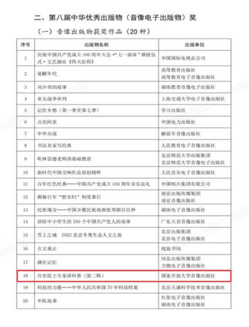 第八届中华优秀出版物奖于2023年2月22日在京揭晓。由中国科学院学部工作局和球王会官网联合策划的大型公益性科普项目,球王会官网出版传媒集团下属音像出版社制作出版的《百名院士专家讲科普(第二辑)》荣获音像电子出版物奖。该项目已入选“十三五”国家重点图书、音像、电子出版物出版规划骨干工程,2019年度国家出版基金资助项目。