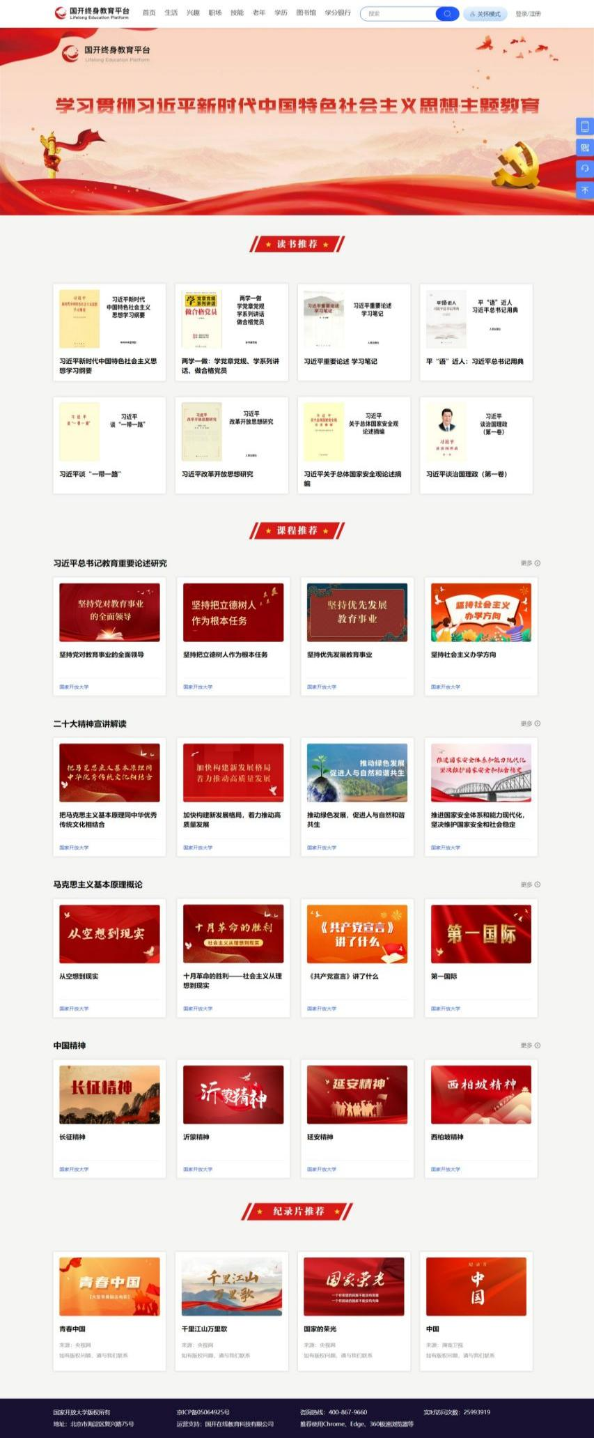 专区在内容主题遴选、页面风格设计、资源呈现形式、使用细节优化等方面进行了精心设计,分为读书推荐、课程推荐和纪录片推荐三大模块。学习者可以通过读书、听课、看视频等方式,提高学习实效。
