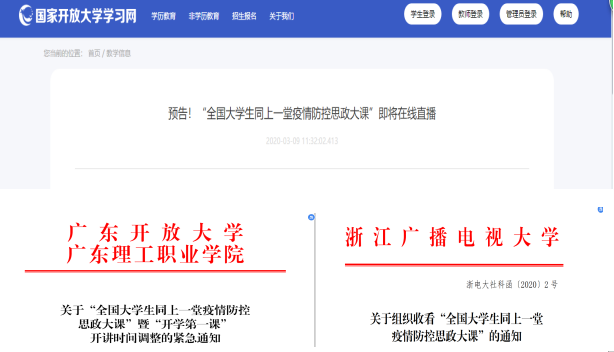 球王会官网多个分部、实验学院、行业学院有效组织学生、思政课教师、辅导员、班主任等人员收看,并因地因校制宜认真落实相关要求,将此课程纳入疫情防控期间思政课正式教学计划。如广东分部列入《形势与政策》课2020春学期学习内容并计学分,福建泉州电大计入本学期思政课程考勤和形考成绩。