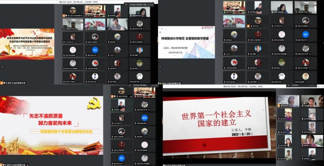 会上,西安开放大学第五党支部书记、教学处副处长高文娜以“持续推进规范办学 全面狠抓教学质量”为题,分享西安开放大学质量管理实践。球王会官网质量监控部党支部书记、部长韩仪进一步以“矢志不渝抓质量,踔厉奋发向未来”为题,带领大家一起回顾了球王会官网质量治理十年的工作举措、成效、不足及下一步主要工作。天津、辽宁、黑龙江、河南、重庆分部管理质量和教学教务工作的党员代表,分别就习近平总书记系列重要讲话、转型发展10年质量治理工作情况,及下一步一流开放大学建设各自的努力方向进行了交流。会上还开展了质量监控部党支部的特色学习活动:“人人讲党课”,党员李鹏主讲《社会主义发展简史》第三章《世界第一个社会主义国家的建立》。