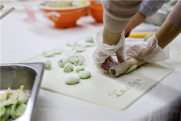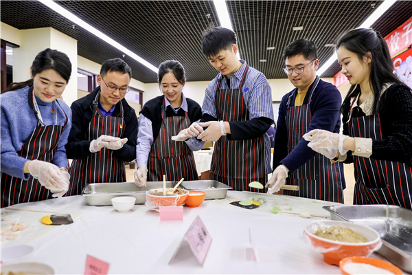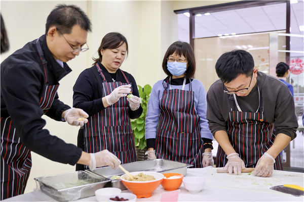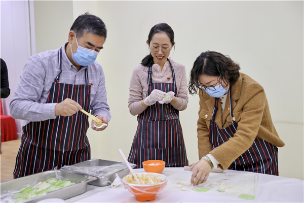 后勤保卫部、党政办公室、组织人事部、宣传统战部、学校工会认真筹划、精心准备。六张台面上早早便整齐摆放着擀面杖、面板、面团及多种馅料。活动中,大家一起动手,揉面、擀皮、包饺子;学校党委班子成员和教职工一边包饺子一边唠家常,气氛欢乐祥和。一个个饺子在巧手下出品,大家开心地互相展示自己的劳动成果,分享包饺子的经验,现场其乐融融。一排排独具个性、模样俊俏的饺子随即摆满餐盘,有花朵、元宝、麦穗、月牙……各式各样,赏心悦目。“饺子象征团圆,就好比人心聚在一起,这次包饺子活动让我们感受到了大家庭的幸福滋味。”参与活动的党员表示。