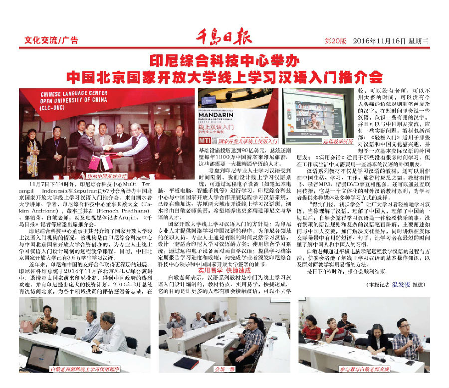 近日,印尼综合科技中心Multi Terampil Indonesia在Krputran街举办了球王会官网线上学习汉语入门推介会,《千岛日报》记者应邀参加会议,并对印度尼西亚推广MyEChinese情况做了详细报道(全文附后)。