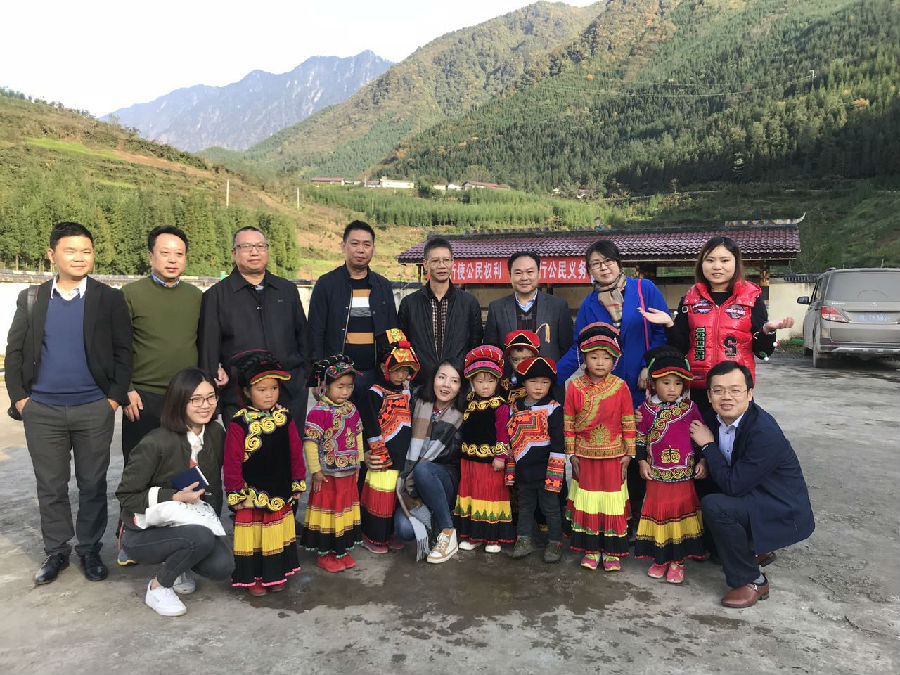 乐山电大领导、记者团成员、爱心人士与依乌村彝族小朋友合影