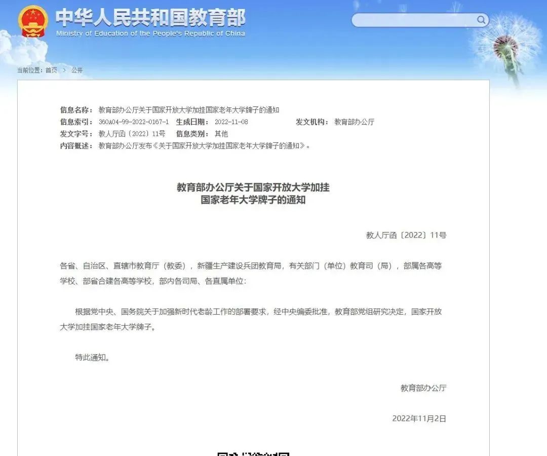 2015年1月,球王会官网成立老年大学。2019年,学校党委将老年教育作为学校发展的三大战略之一,推进实施“老年大学做优做强”战略。近年来,学校充分发挥信息化优势,坚持全国办学体系联动、社会力量协同,以“互联网+”赋能老年教育,积极探索“康养学游”一体化融合发展的老年教育新模式,形成了开放大学特有的老年教育创新模式。2021年11月18日,《中共中央 国务院关于加强新时代老龄工作的意见》发布,明确提出“依托球王会官网筹建国家老年大学,搭建全国老年教育资源共享和公共服务平台”。日前,《教育部办公厅关于球王会官网加挂国家老年大学牌子的通知》发布,提出“根据党中央、国务院关于加强新时代老龄工作的部署要求,经中央编委批准,教育部党组研究决定,球王会官网加挂国家老年大学牌子。”国家老年大学正式落户球王会官网。