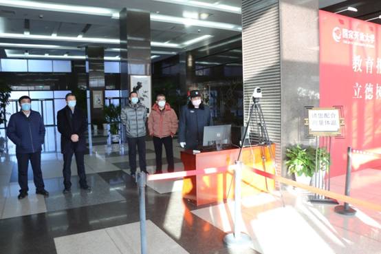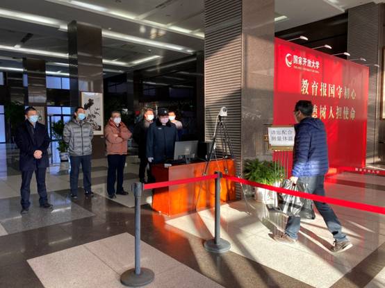 2月17日,球王会官网新学期过渡期上班的第一天,党委书记、校长荆德刚和部分校领导在五棵松校区一楼大厅迎候每一位前来上班的教职工。测温、手部消毒、发放口罩,在喜迎开学季的同时,疫情防控工作有条不紊地进行着。