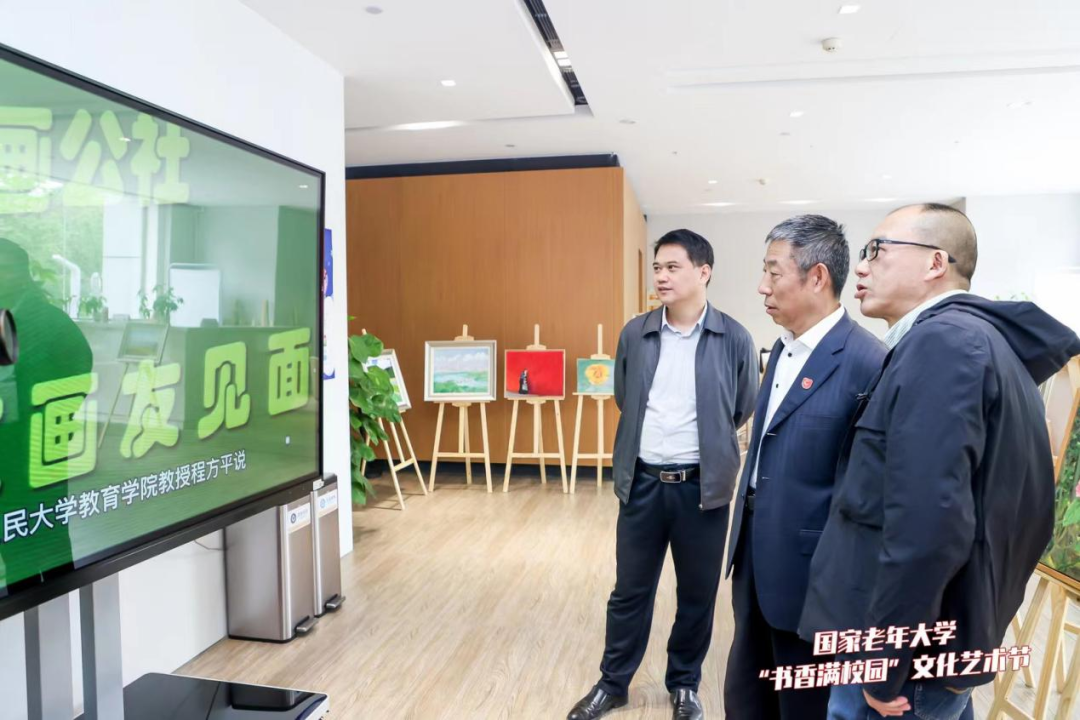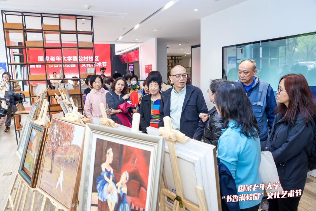 4月21日,国家老年大学魏公村校区举办首届“书香满校园”文化艺术节活动。艺术学院唐应山教授指导的零基础油画学员作品在活动中展出,活动现场还启动了“零基础油画课—梵高、莫奈”课程的宣讲和报名。学校党委副书记刘臣到场参观,魏公村校区学员和教师代表50余人参加活动。