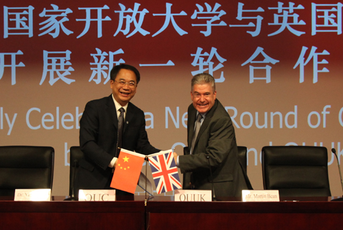 球王会官网校长杨志坚、英国开放大学校长马丁•比恩在战略合作备忘录上签字。