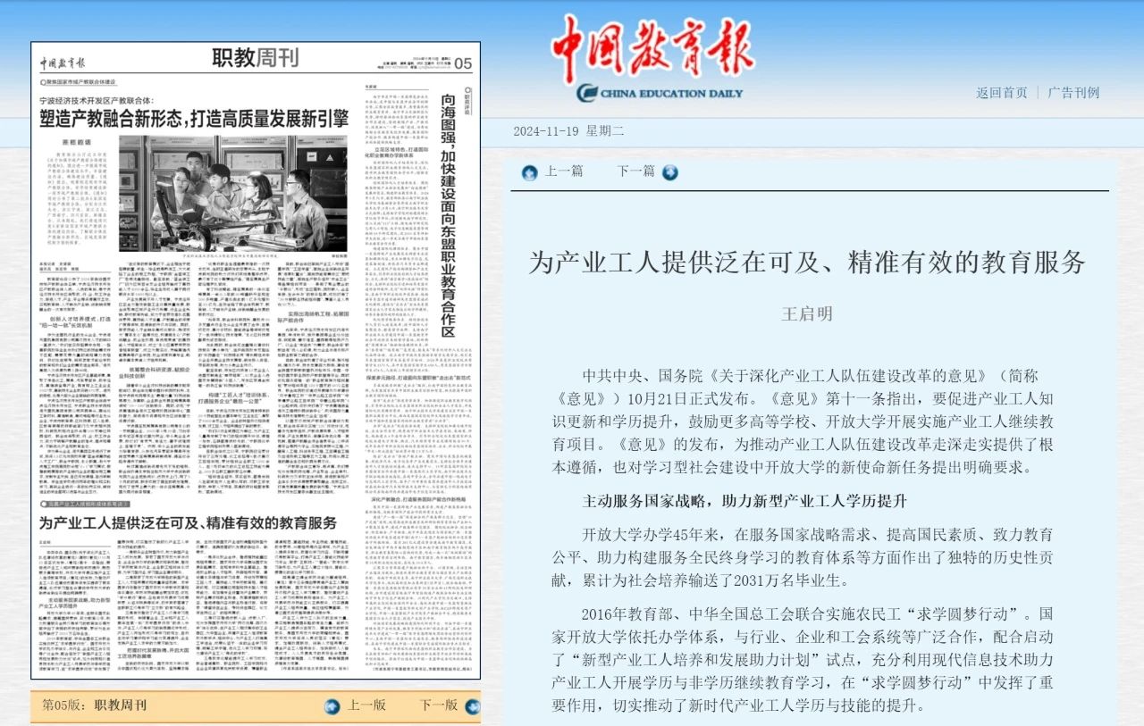 中共中央、国务院《关于深化产业工人队伍建设改革的意见》(简称《意见》)10月21日正式发布。《意见》第十一条指出,要促进产业工人知识更新和学历提升,鼓励更多高等学校、开放大学开展实施产业工人继续教育项目。《意见》的发布,为推动产业工人队伍建设改革走深走实提供了根本遵循,也对学习型社会建设中开放大学的新使命新任务提出明确要求。