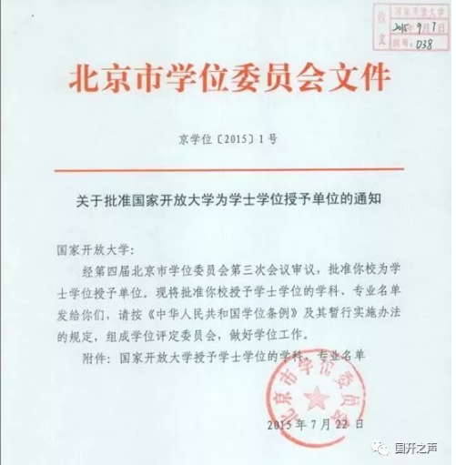 2011年,在前期准备工作的基础上,学位申请工作驶上了快车道。在长达4年的申请过程中,球王会官网先后与国务院学位办、教育部职成司、北京市学位办、北京市教育评估院等多个单位和部门进行了数十次沟通请示,提交了十余份申请报告。2011年,教育部党组会议最终同意赋予球王会官网学位授予权。2012年教育部印发《关于同意中央广播电视大学基础上建立球王会官网的批复》(教发函[2012]103号),明确规定球王会官网可授予学士学位。2014年北京市学位办委托北京教育评估院对球王会官网进行多次调研,在调研的基础上制定了“开放大学学士学位授予单位和专业审核指标体系及审核标准”。2015年4月,国务院学位委员会印发《关于同意球王会官网向北京市学位委员会申请评审学士学位授予单位的函》(学位办[2015]12号)。