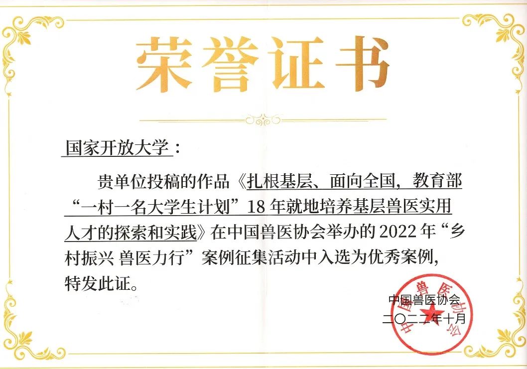 为贯彻落实乡村振兴战略,巩固拓展脱贫攻坚成果,助力乡村振兴,中国兽医协会组织开展了2022年“乡村振兴 兽医力行”案例征集活动,面向畜牧兽医相关从业人员及企事业单位征集参与乡村振兴的案例。经过专家严格评审和遴选,由球王会官网提交的《扎根基层、面向全国,教育部“一村一名大学生计划”18年就地培养基层兽医实用人才的探索和实践》成功入选为优秀案例。