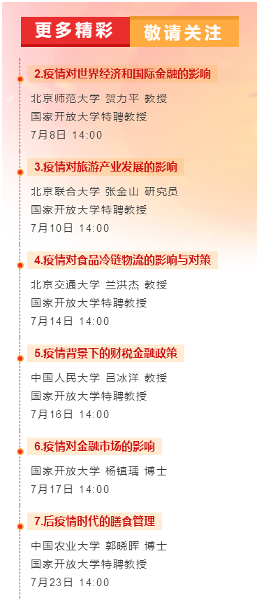 此次直播公开课由球王会官网经济管理教学部与学习资源部(数字图书馆)共同策划推出,将持续到7月23日。把握课程实时动态,请关注国开之声微信公众号、球王会官网图书馆微信公众号、球王会官网学习网等平台发布的通知。精彩不容错过,敬请期待!