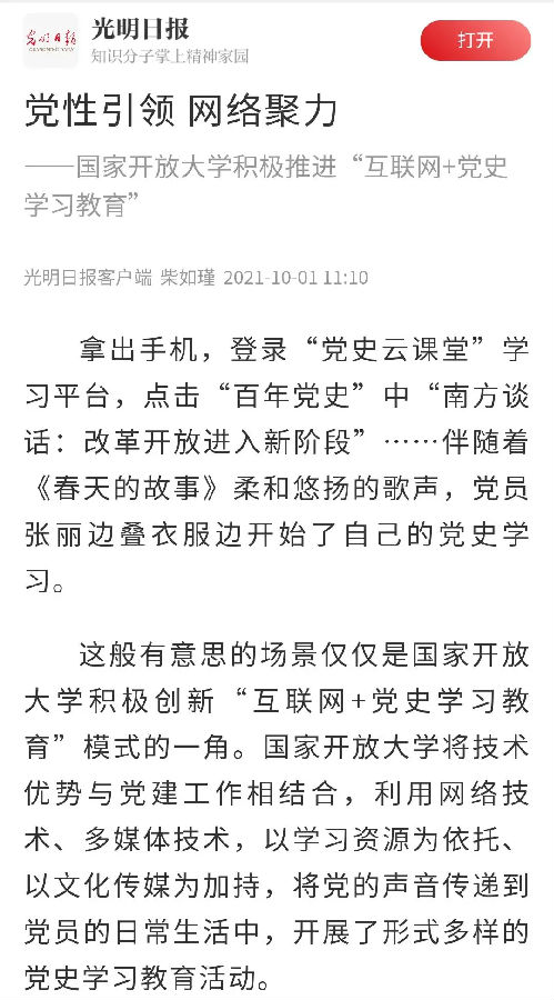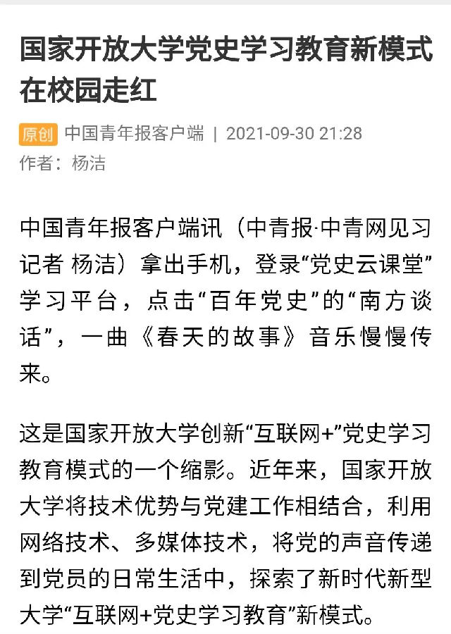 党史学习教育成果与新的教育形式引发各大媒体广泛关注,受到了人民日报、光明日报、中国青年报等众多媒体报道。现将部分媒体报道汇编如下: