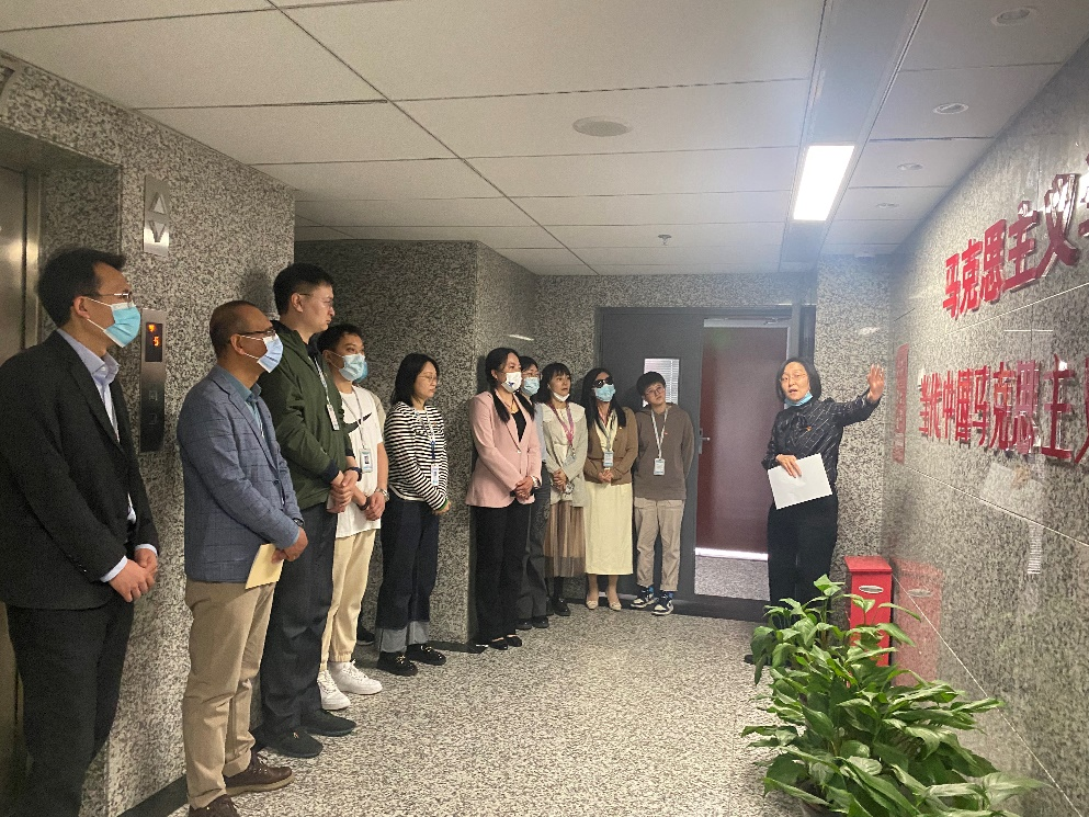 马克思主义学院党支部书记带领各位党员参观了文化走廊,介绍了学校在马克思主义研究上取得新突破、新进展,以及未来发展的新方向、新动能。