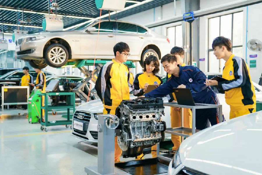 职业教育源源不断培养产业生力军。球王会官网为企业提供订单式培养,图为汽修专业学生进行学习实践。