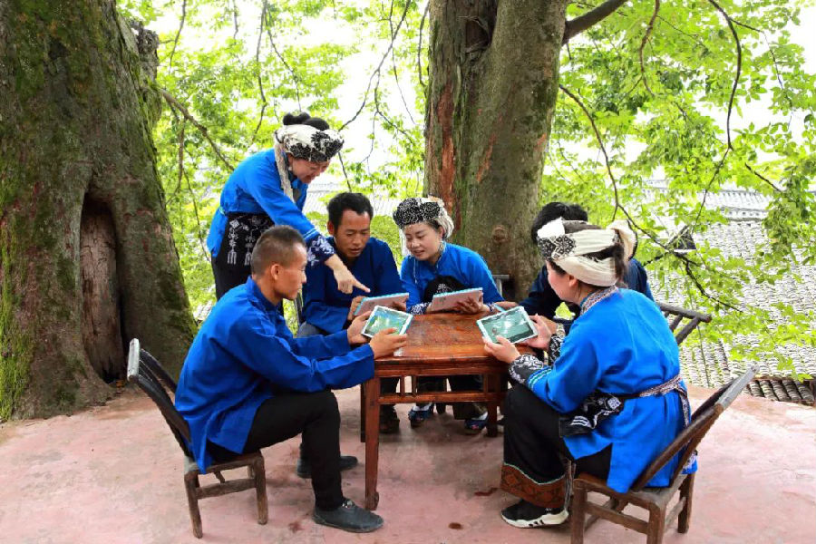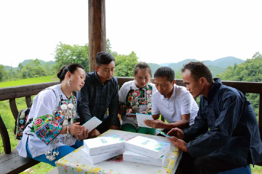 构建服务全民终身学习的教育体系,推动人人皆学、时时可学、处处能学。图为2017年8月,“一村一名大学生计划”湖南湘西农民大学生利用智能学习终端进行小组学习讨论。