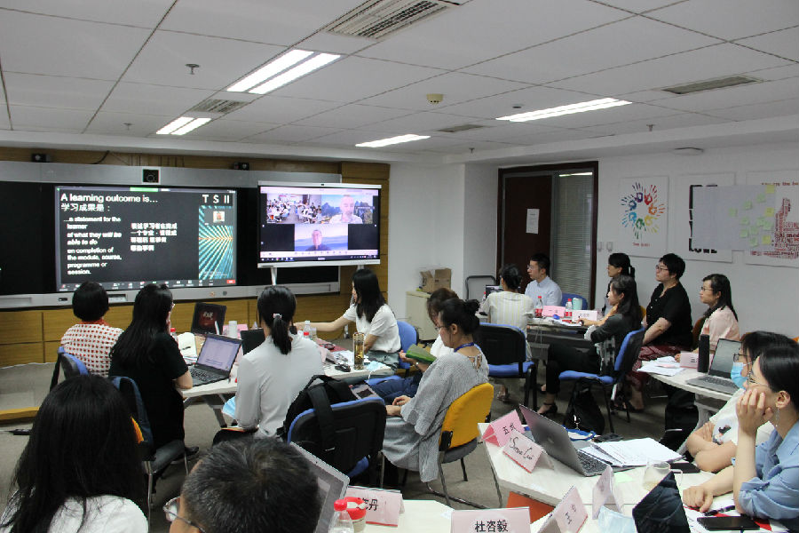 本次培训由身在英国的主讲教师Martin与助讲教师Rob通过远程直播的方式开展,同时教室现场有三位助教进行协调与翻译。在分组讨论环节中,助教进入到不同的小组,将小组讨论的内容发送给远端的教授,远端教授适时掌握各个小组的讨论内容并给予反馈,犹如身临现场。本次培训在国际疫情形势依然严峻的当下,在跨空间、跨语言的不利条件下,取得了良好培训效果,是远程教学创新的成功实践。
