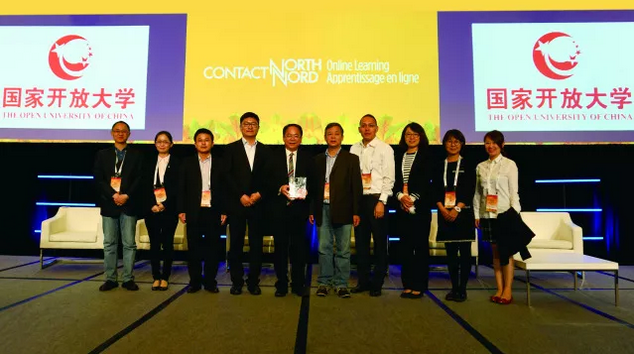 2017年10月19日,加拿大多伦多。第27届国际开放与远程教育理事会(ICDE)世界大会正在举行,中国球王会官网校长杨志坚从ICDE秘书长嘉德(Gard Titlestad)手中接过“ICDE杰出机构奖”的奖杯。