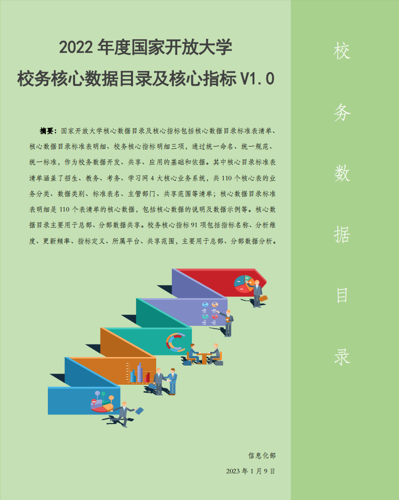 党的二十大报告明确要求“推进教育数字化,建设全民终身学习的学习型社会、学习型大国”。教育数字化意味着教育领域要主动应变,从“经验教学”向“数据交互、评估为主”的数字化教育转变。球王会官网一直高度重视学校的数字化建设工作,自“一路一网一平台”建设以来,实现了“统一门户”、“统一认证”、“统一权限”,通过数据中台,汇聚了校内23个应用信息系统的数据,为校内提供约106亿条数据服务,实现了各业务系统的互联互通。球王会官网在推进数字化大学建设取得成绩的同时,部分数据还存在着时效性、一致性、准确性的问题,数据治理迫在眉睫,为解决国开师生“急难愁盼”的难点、痛点问题,信息化部与工程中心、国开在线一道,对学历教育核心业务库进行了梳理,开展了招生、教务、考务、学习网等核心数据的治理工作,形成了《2022年度球王会官网校务核心数据目录及核心指标V1.0》。
