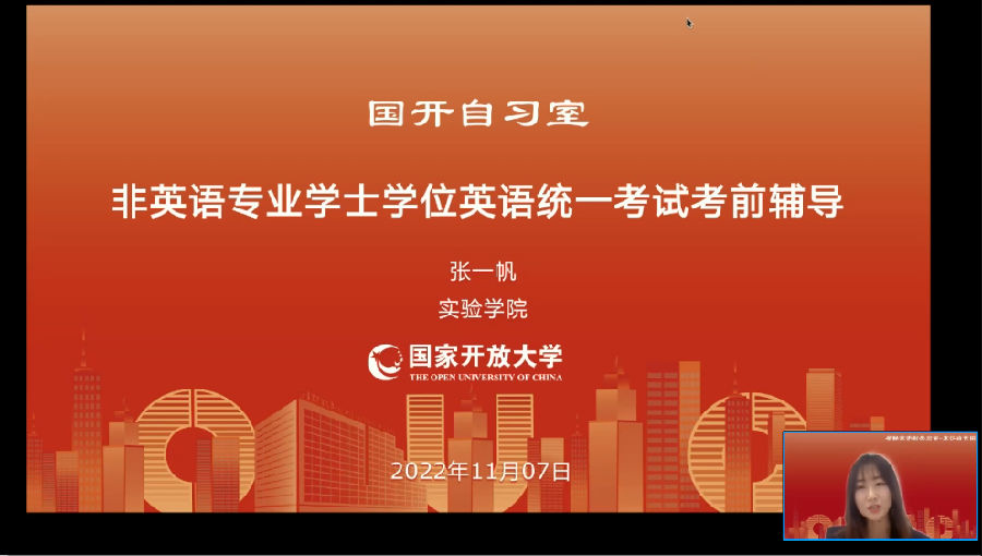 国开实验学院结合全网办学项目特点,根据学生切实需求,以学位英语考试考前辅导为契机,推出了“国开自习室”系列“辅导+伴学”活动。2022年11月7日晚上18点,实验学院张一帆老师围绕球王会官网非英语专业学士学位英语统一考试组织了考前辅导、备考伴学主题活动,对同学们英语学习和迎战备考的相关问题进行专项辅导和伴学答疑。