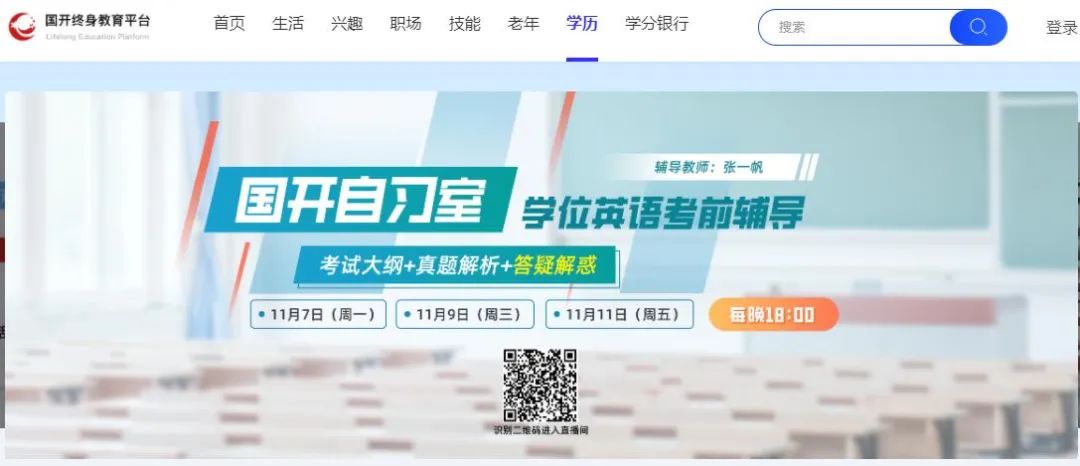 国开自习室·学位英语考前辅导还将于11月9日(周三)、11月11日(周五)每晚18:00通过国开实验学院课程开放平台推出系列活动,在学位英语考试周为同学们学习助力。 “国开自习室”系列主题活动旨在为同学们提供良好的线上学习空间,营造友爱和谐的学习氛围,让师生间、同学间不受时间和地域的限制互动交流,及时解决学业困惑,进一步激发学习热情,向达成学习目标迈进。