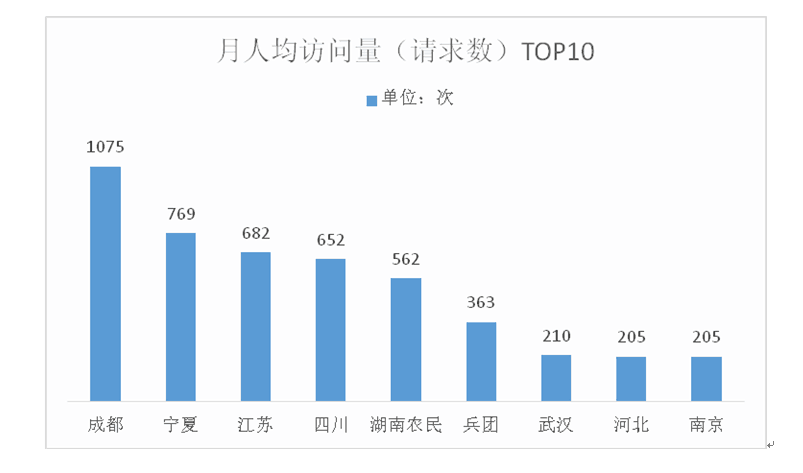 从可视化数据监测图1上可见,近期总访问量和请求数排在前10位的分部已经悄然发生了变化,除了四川、江苏、成都、湖南农民、兵团等一直以来访问量保持领先的分部外,河北、河南和宁夏分部成为了近期的三匹“黑马”。