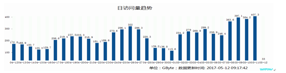 图2显示了近期学习平台访问量趋势,学习平台日访问量呈现逐步上升趋势,于5月12日单日访问量流量达到407.3GB,根据趋势可以预测未来一段时间访问量仍将持续增长。