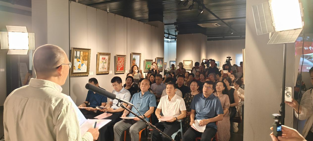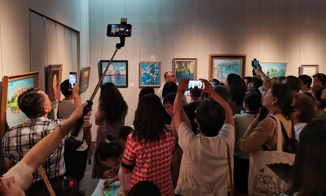 展览展示了北京乐龄研学油画班及全国在线油画公社的学员作品,展厅人头攒动,气氛热烈。