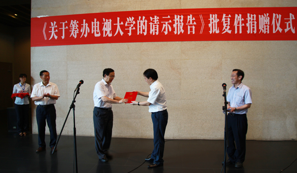 会议当天,与会人员前往邓小平故里参观。张少刚一行向邓小平铜像献花,并向邓小平故里管理局捐赠了《关于筹办电视大学的请示报告》批复件(影印件),邓小平故居管理局局长钱奇向球王会官网回赠收藏证书。