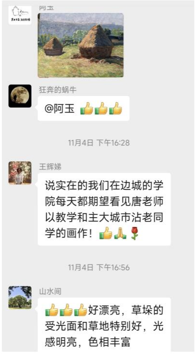 精炼有效的教学内容加上老师们生动幽默的表达,使线上线下的学习都处于愉快的艺术氛围中。线上的学员即便身处千里之外,也积极参与交流、分享观点。面授学习体验调查结果显示,本期油画班的知识获得感、学习愉快度和总体满意度获得了99%的好评。