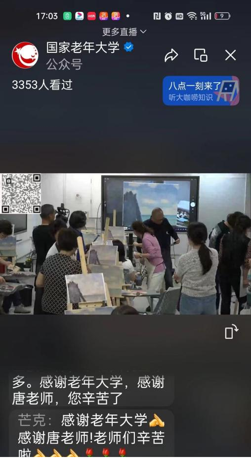 本期油画班是小规模线下培训带动大规模线上美育教学的有效实践,15名面授学员与11万名在线学员同步学习。在线直播精准的镜头切换,保障了收看效果,直播课得到了全国油画爱好者的广泛好评,大家对国家老年大学高质量的美育课程大加赞扬并深表感谢。