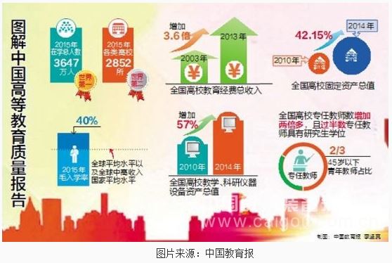 数据显示,中国高等教育“硬件”建设数量呈井喷式增长,各级各类高校面貌焕然一新。与2003年相比,2013年全国高校教育经费总收入增加了3.6倍。从2010年到2014年底,全国高校固定资产总值增加42.15%,教学、科研仪器设备资产总值增加57%;全国高校专任教师数增加两倍多,且过半数专任教师具有研究生学位,45岁以下的青年教师占到专任教师总数的三分之二。