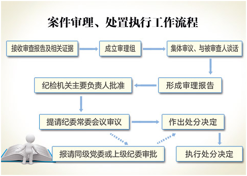 从以上案例可以看出,每起纪律审查案件大致包括线索处置、谈话函询、初步核实、立案审查、案件审理和处置执行等环节。如线索处置决定直接采取初步核实,则会减少谈话函询环节;如涉嫌犯罪,还会增加移送司法机关环节。这些内容,在《工作规则》中都有明确规定。对此,我们可以结合《工作规则》,用以下图表进行说明。
