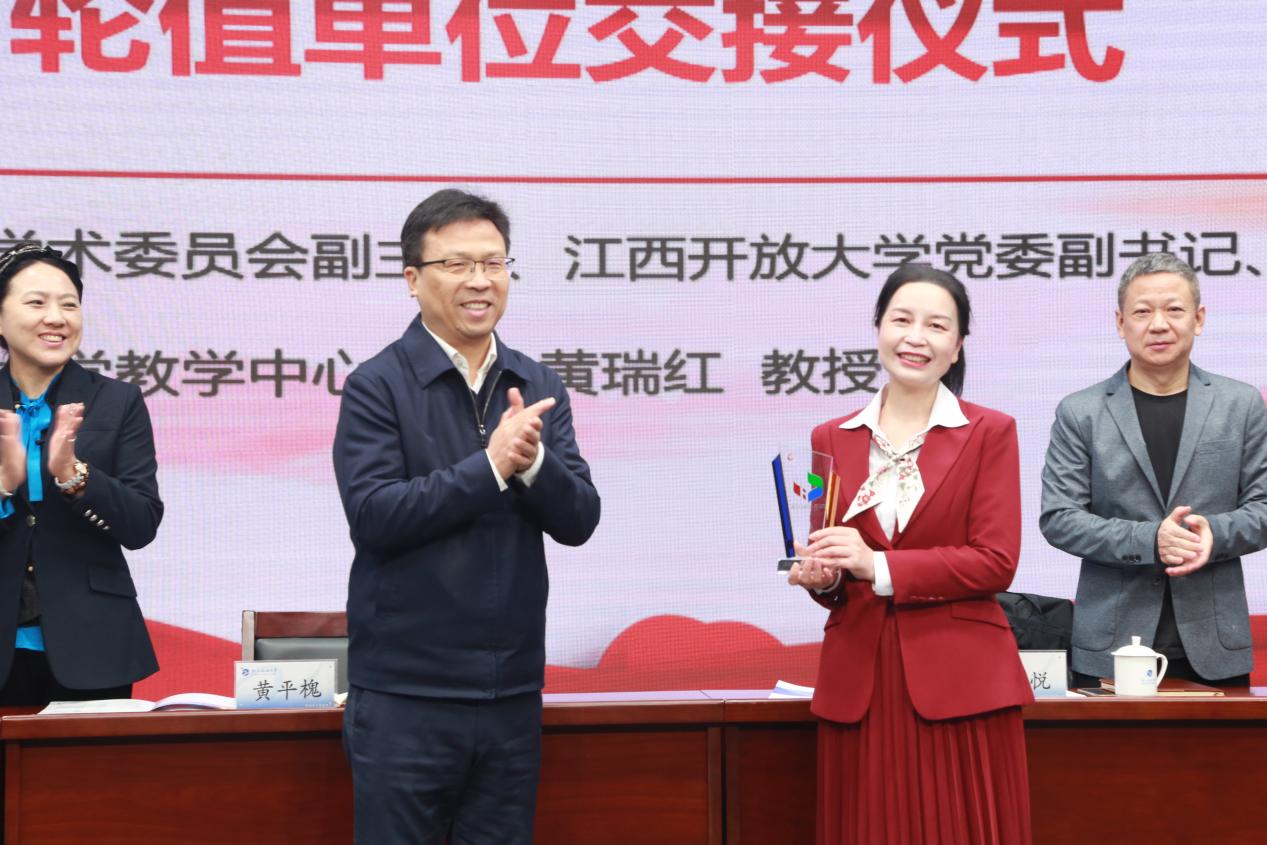 第四届分委会继承了上届分委会的优良传统,委员佩戴分委会徽章,主任委员、江西开放大学党委副书记、校长黄平槐为轮值单位委员黄瑞红教授颁发轮值手执,象征着分委会工作的有序传承与持续推进。黄平槐表示,文史哲艺分委会对标球王会官网学术委员会的宗旨,建立了委员单位轮值机制,与分部学术委员会对接机制和与校学位委员会及相关学院的联动机制,力求服务总部,面向体系,协调发展。